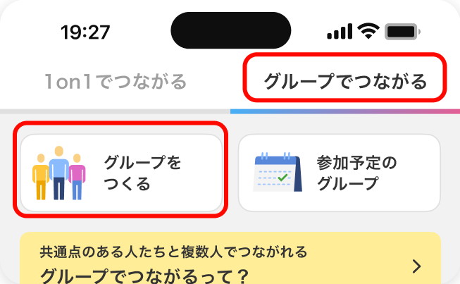 「グループでつながる」タブから、「グループをつくる」をタップします。