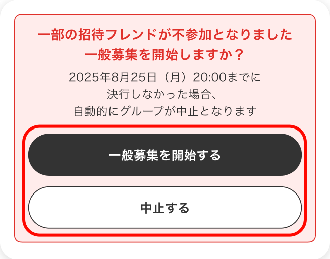- 指定した紹介フレンドが一部でもグループ参加を辞退し、開催日時の24時間前までに一般募集を開始するかグループを中止するか選択しなかった場合