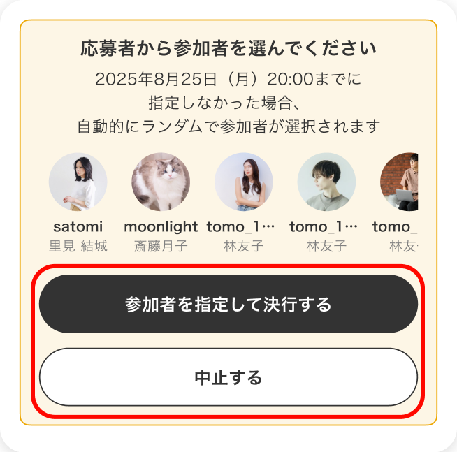 応募者数が予定人数より少ない、または多い場合であっても、主催者を含め最小3人〜最大8人の間の人数で参加者を決定することができます。