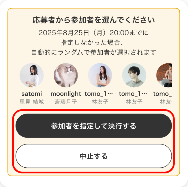 応募者数が予定人数より少ない、または多い場合であっても、主催者および招待フレンドを含め最小3人〜最大8人の間の人数で参加者を決定することができます。