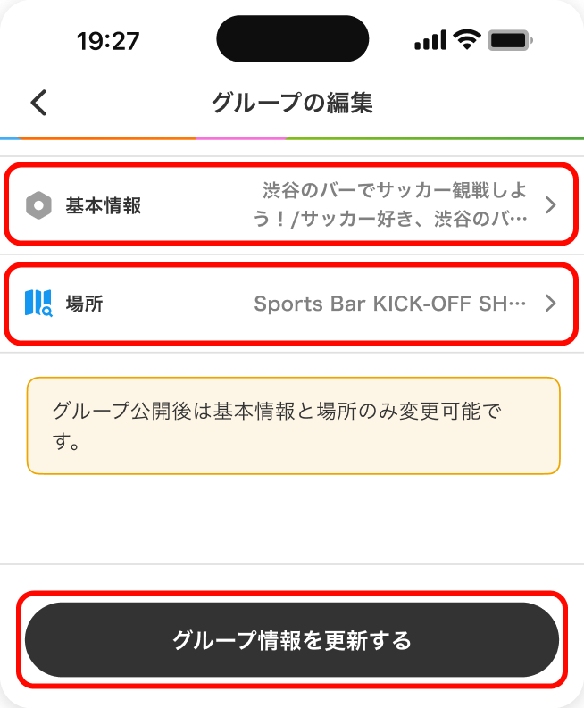 自分が主催しているグループの詳細から編集に進み、編集したい項目を修正してから「グループ情報を更新する」をタップします。