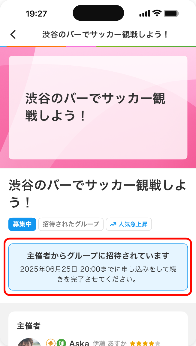 自分が招待されているグループの詳細画面には、「主催者からグループに招待されています」というアナウンスと回答期限が表示されます。 -