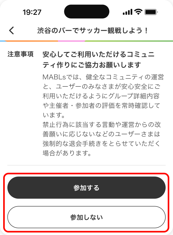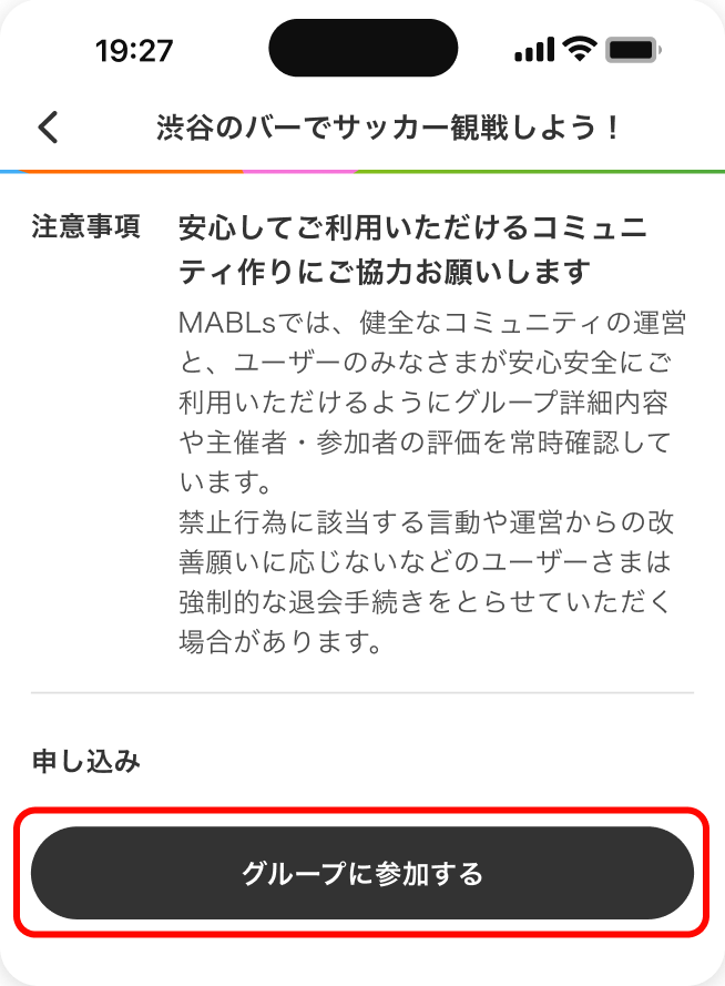 グループの詳細情報をよく確認し、参加を希望する場合は申し込み欄から「グループに参加する」ボタンをタップし、参加申込を行います。