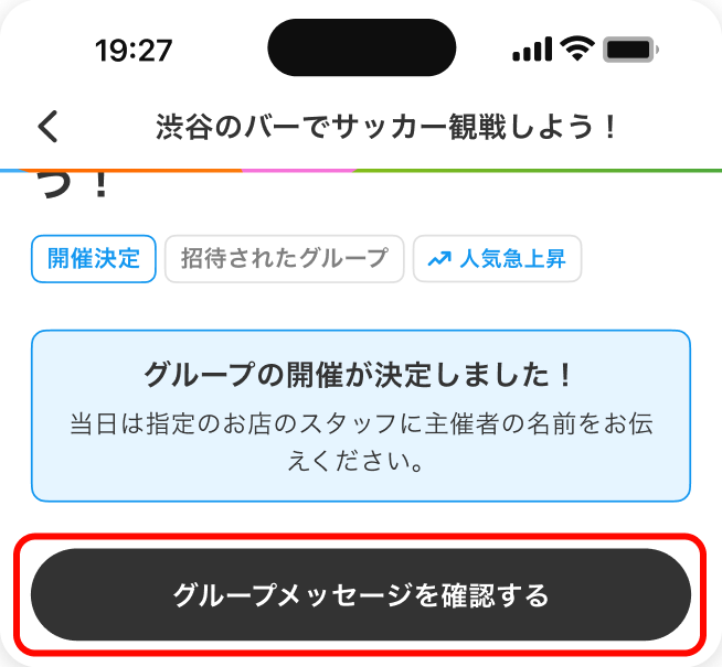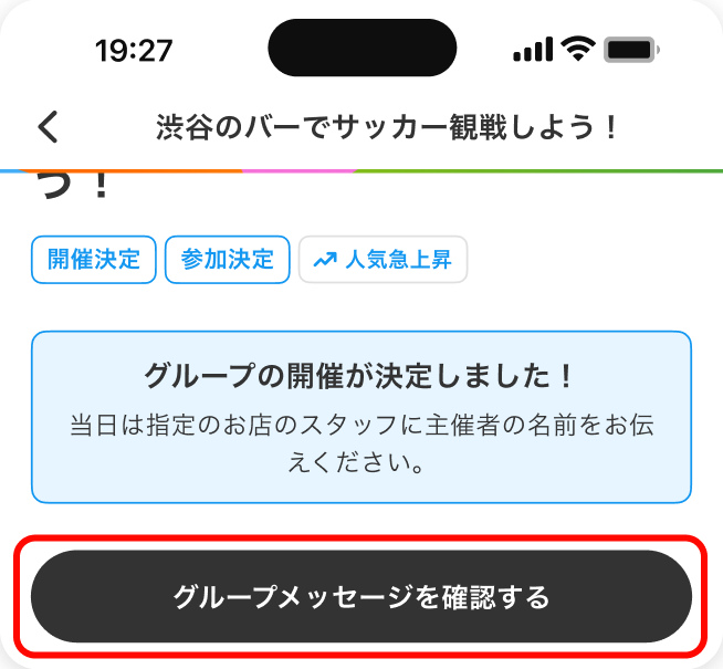 「参加する」を選択した場合、グループの開催が決定すると、他の参加者とのグループメッセージ機能が利用可能になります。