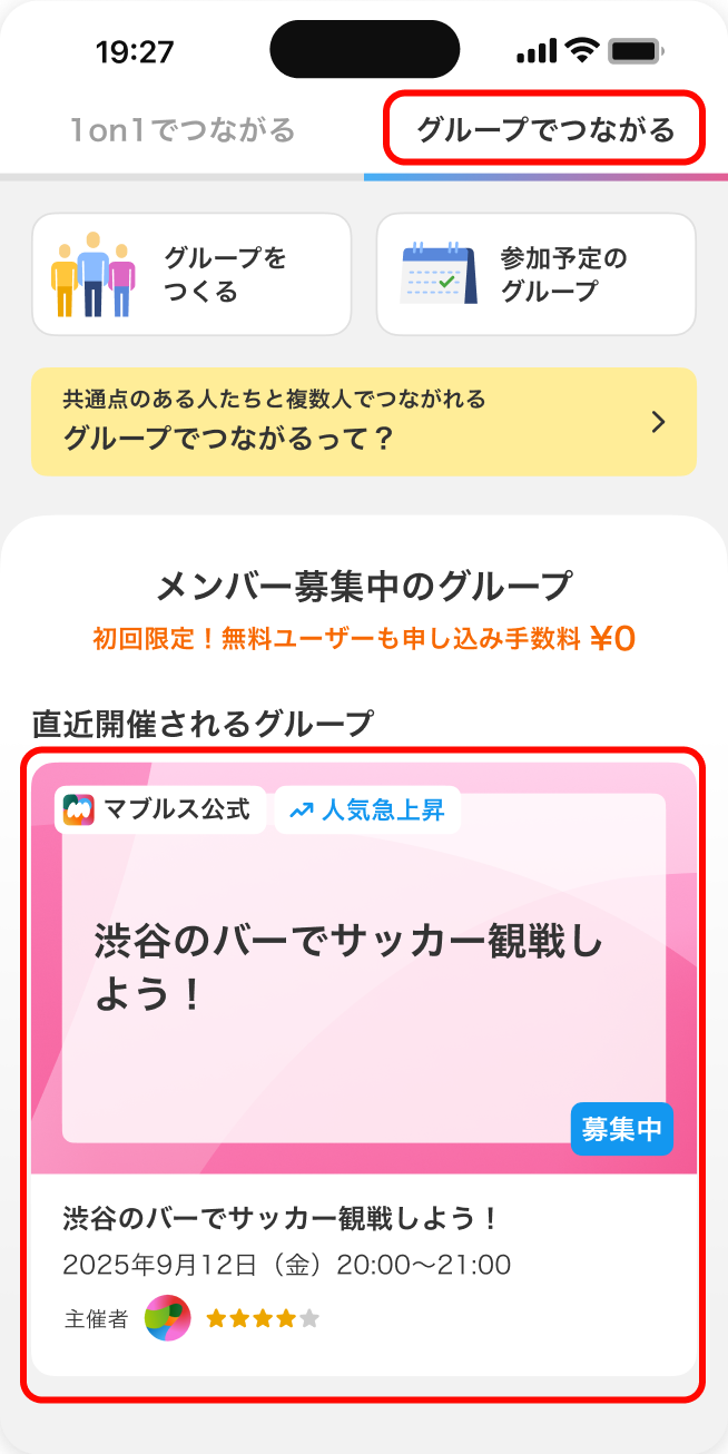 「グループでつながる」タブに表示されているメンバー募集中のグループから、参加したいグループをタップします。 開催日や予算などの条件を指定してグループを検索することも可能です。