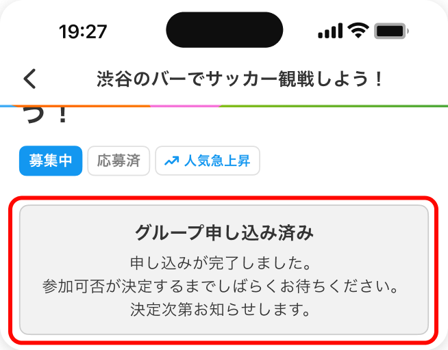 参加申込を行うと、グループ詳細画面のステータスが「応募済」となり、「グループ申込済み」のメッセージが表示されます。