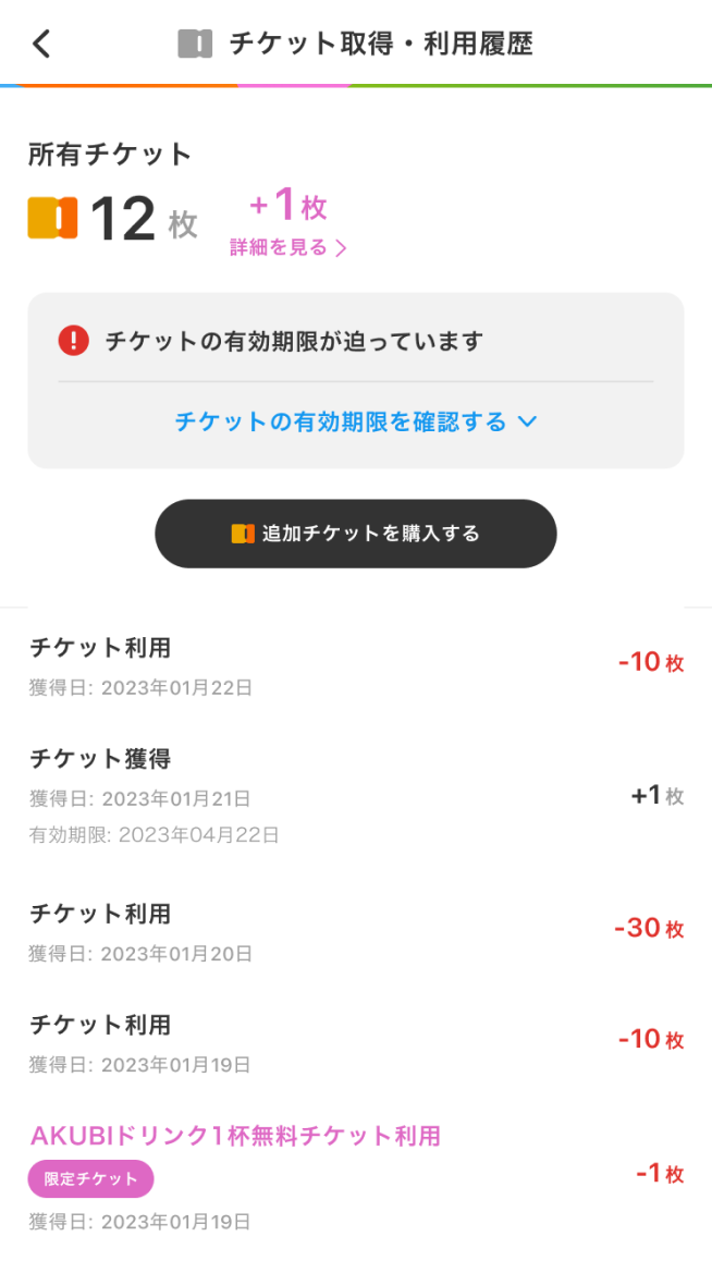 チケット取得・利用履歴画面にて、所有チケット枚数、有効期限、獲得履歴が確認できます。