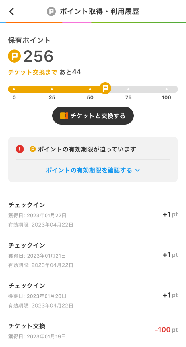 チケット/ポイントの取得・利用履歴、有効期限を確認することができます。